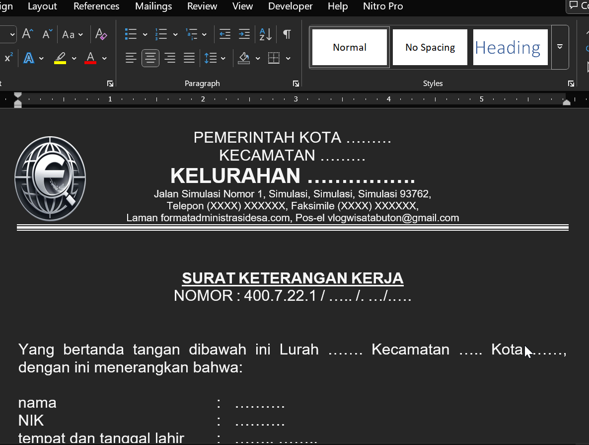 Template Surat Keterangan Kerja dari Kelurahan (Aktif Bekerja) - Format Permendagri 1/2023
