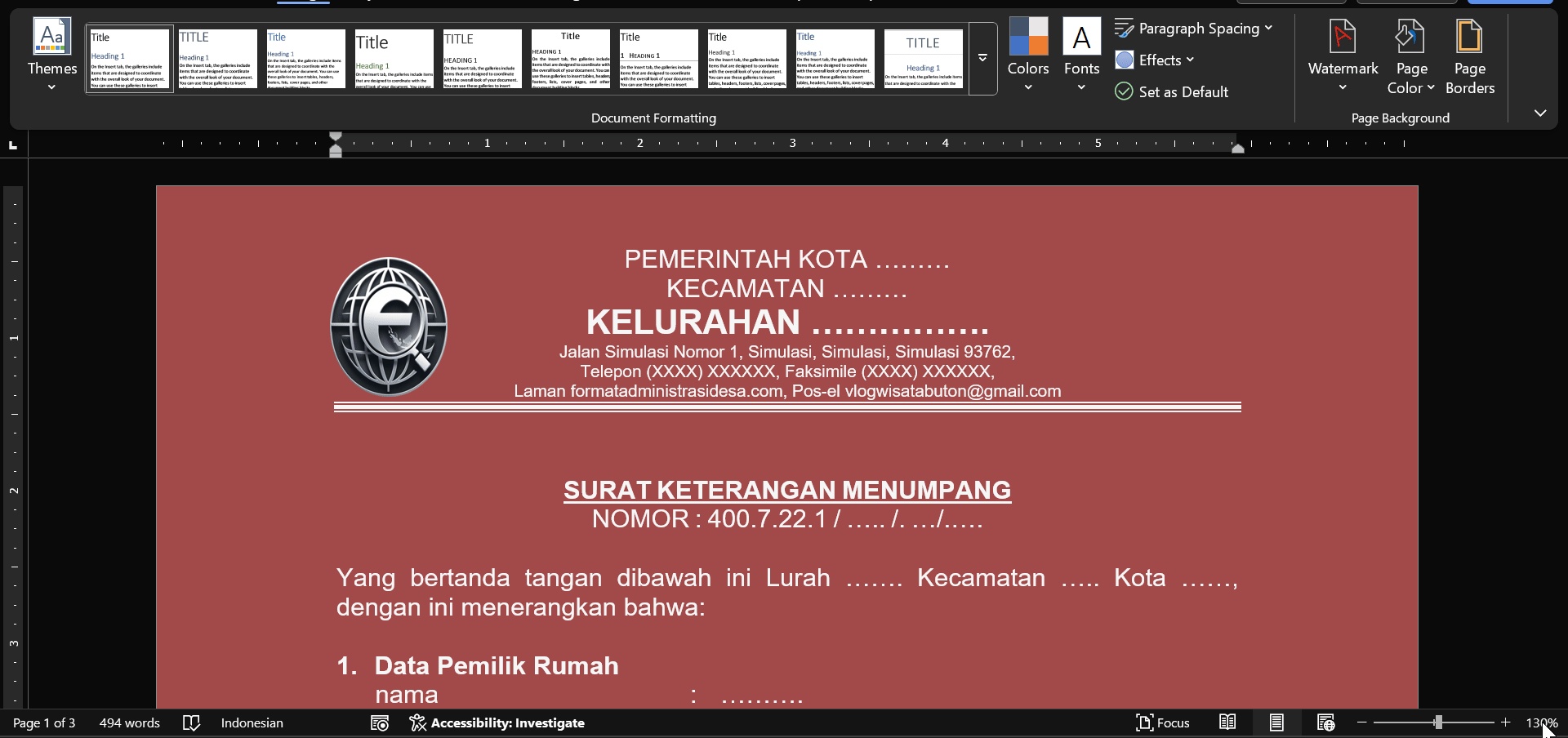 💡 Format Word (.dotx): Bisa langsung disesuaikan sesuai data warga dan kebutuhan kelurahan melalui Word. Dapat pula dipakai sebagai template resmi jika anda ingin mengintegrasikannya ke aplikasi pelayanan surat di kelurahan anda.